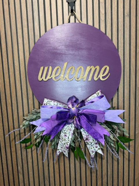 Brighten your entryway with elegance and charm using this handcrafted 18 inch purple “Welcome” door hanger — perfect for those who love warm hospitality with a touch of floral beauty. Featuring a rich, deep purple wooden base with bold gold lettering, this piece is accented with a stunning layered bow in complementary shades of lavender, violet, and floral print. Lush greenery and delicate lavender sprigs add natural texture and grace, making it ideal for spring, summer, or everyday use. Whether you're a lover of purple or just want to greet guests with style, this eye-catching door decor is a heartfelt way to say “you’re home.”