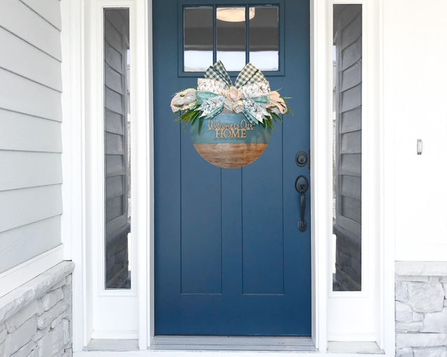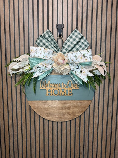 Create a warm, inviting entryway with this beautifully handcrafted 18 inch “Welcome to Our Home” door hanger — the perfect touch for farmhouse lovers and cozy home décor enthusiasts. Featuring a serene combination of sage green and natural wood, this round wooden sign is adorned with a stunning arrangement of florals, greenery, and layered bows in gingham, velvet, and floral prints. A soft ivory peony adds a romantic centerpiece, while the golden text brings a charming pop of warmth. Whether you’re decorating for a new season or gifting a loved one, this door hanger is a timeless way to greet guests with elegance and heart.