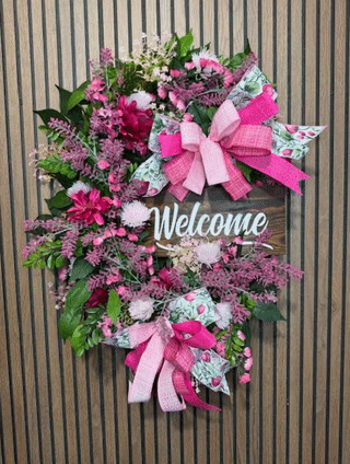 Add a burst of blooming beauty to your space with this handcrafted pink floral “Welcome” wreath — perfect for anyone who loves feminine charm and garden-inspired décor. Overflowing with lush greenery and vibrant pink florals, this wreath features elegant textures, soft pastels, and bold magenta accents that feel both fresh and inviting. Coordinating floral-print and textured bows in shades of pink brings a playful yet refined finish, while the rustic wooden sign with white “Welcome” lettering ties it all together with warmth. Ideal for spring, summer, or year-round cheer, this wreath is a stunning way to make your front door or entryway truly unforgettable.