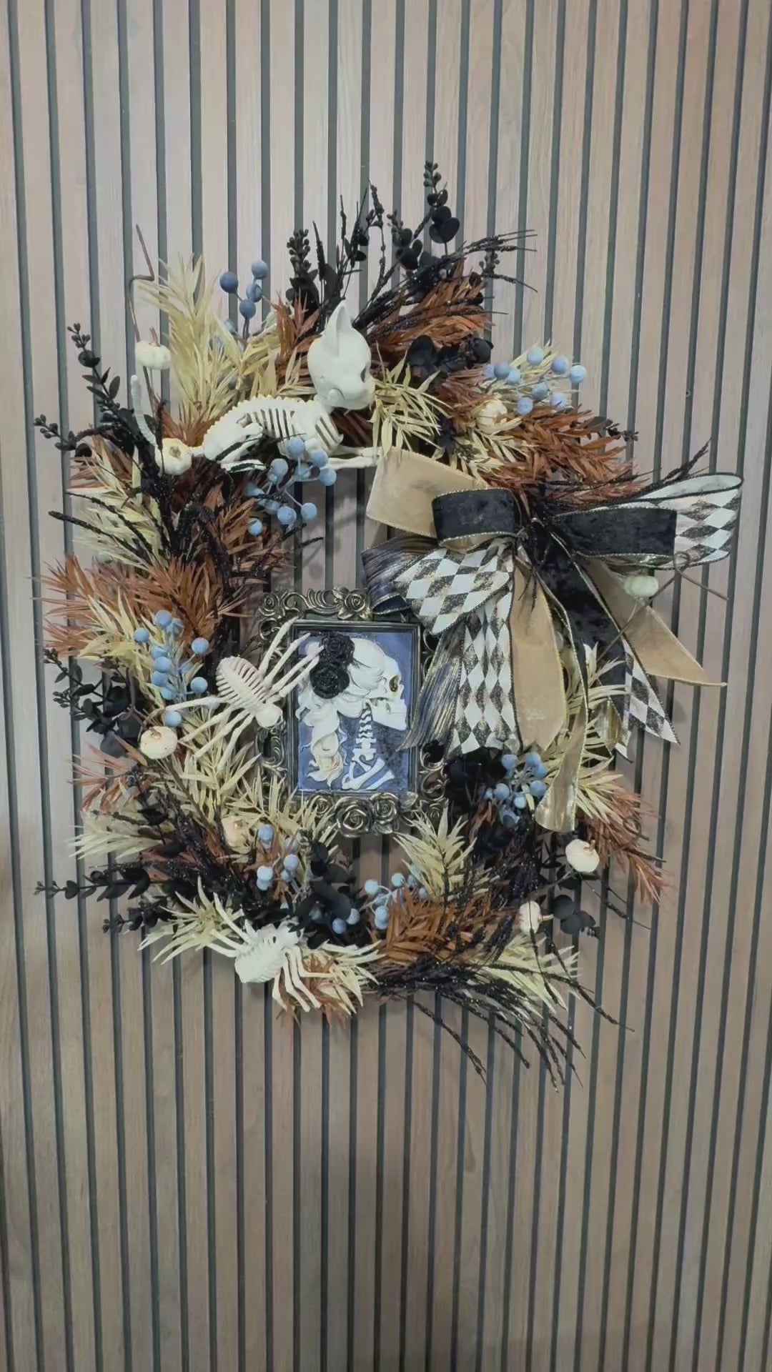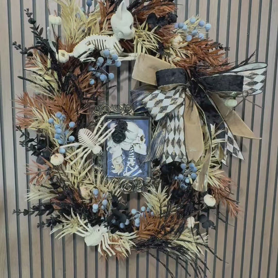 Crafted with a lush mix of beige wheat, midnight black foliage, and rustic orange sprays, this wreath sets the stage for the striking centerpiece — a cameo-style skeletal portrait framed in intricate black scrollwork. Surrounding it are playful skeletal figures, ghostly blue berries, and mini bone-white pumpkins that add a touch of eerie charm.